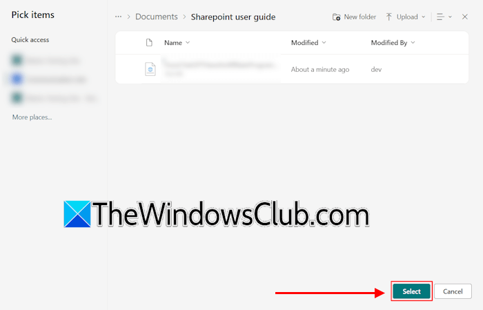 Hvis du vil integrere mapper eller filer i SharePoint-kontoen din, finner du disse filene eller mappene i SharePoint-kontoen din og velger dem.