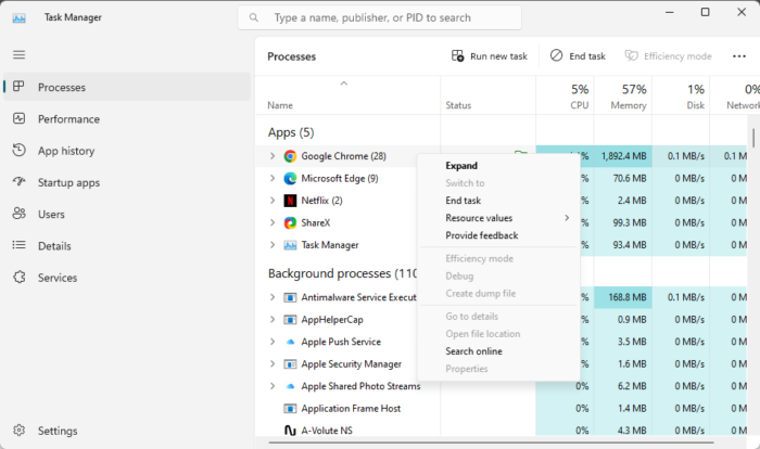 Hvis problemet vedvarer, lukk alle bakgrunnsapplikasjoner. Bakgrunnsapplikasjoner fortsetter å forbruke systemressursene våre, så hvis du deaktiverer dem, frigjøres litt RAM for andre nyttige applikasjoner. Åpne Oppgavebehandling og søk etter alle bakgrunnsapplikasjoner underSøknaderfanen. Høyreklikk på hvert bakgrunnsprogram og velgAvslutt oppgaven.