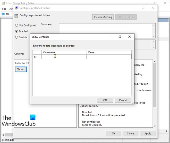 - Dobbeltklikk påKonfigurer beskyttede mapperpolicy i høyre rute for å redigere egenskapene.