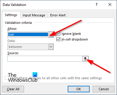 - Under Tillat klikker du på rullegardinpilen og klikker på Liste fra rullegardinlisten.