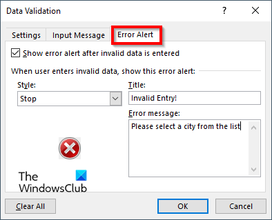 Hvis du vil at en melding skal dukke opp når noen prøver å skrive inn noe som ikke er i rullegardinlisten din, klikker du påFeilvarselfanen.