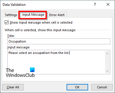 Hvis du vil legge til en meldingspoppopp, kan du klikke påSkriv inn meldingfanen og merk av for "Vis inndatamelding når celle er valgt."