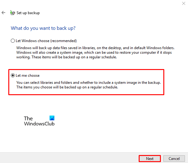 På siden "Sett opp sikkerhetskopiering" vil Windows be deg velge måten å sikkerhetskopiere, sjekkLa meg velgeavmerkingsboksen, og trykk deretter påNesteknapp.