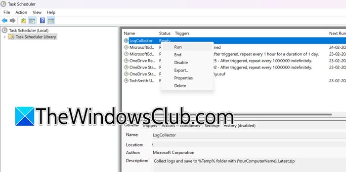 - VelgeKjør som administrator, naviger til Task Scheduler Library, og gå deretter til rotkatalogen for å finne den planlagte oppgaven kalt LogCollector.