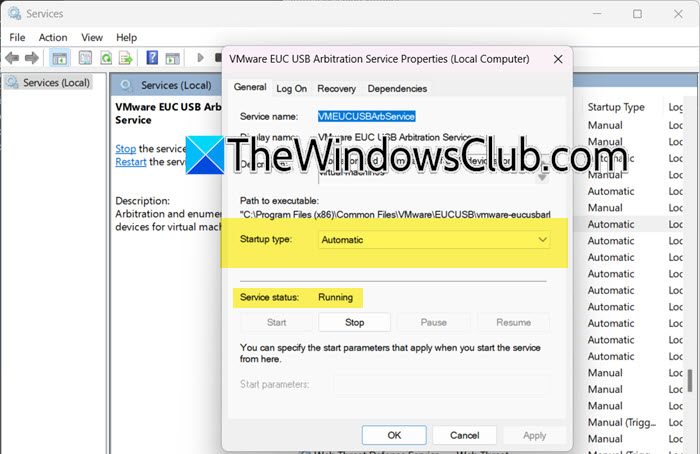 - I Tjenester-vinduet finner duVMware EUC USB Arbitration Service, og høyreklikk på den.