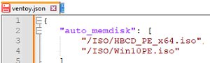 Wcześniej pokazałem, jak ręcznie uruchomić obraz WinPE w trybie memdisk. Dodaj następujące linie doventoy.jsonaby automatycznie uruchomić określone obrazy ISO w tym trybie: