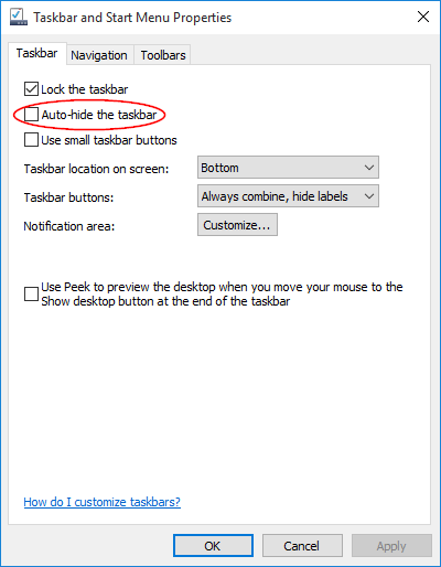 - Kliknij kartę Pasek zadań, wyczyśćAutomatyczne ukrywanie paska zadańpole wyboru, a następnie kliknijOK.