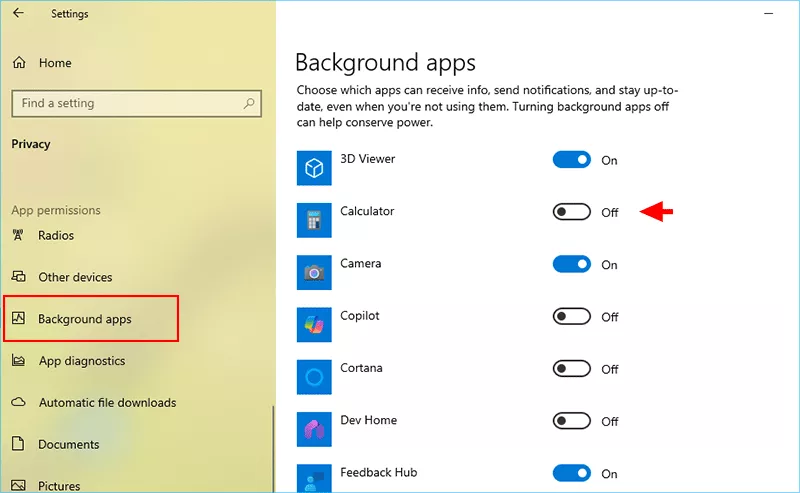 Krok 2:Wybierz aplikacje, których nie chcesz uruchamiać w tle, aby je wyłączyć.