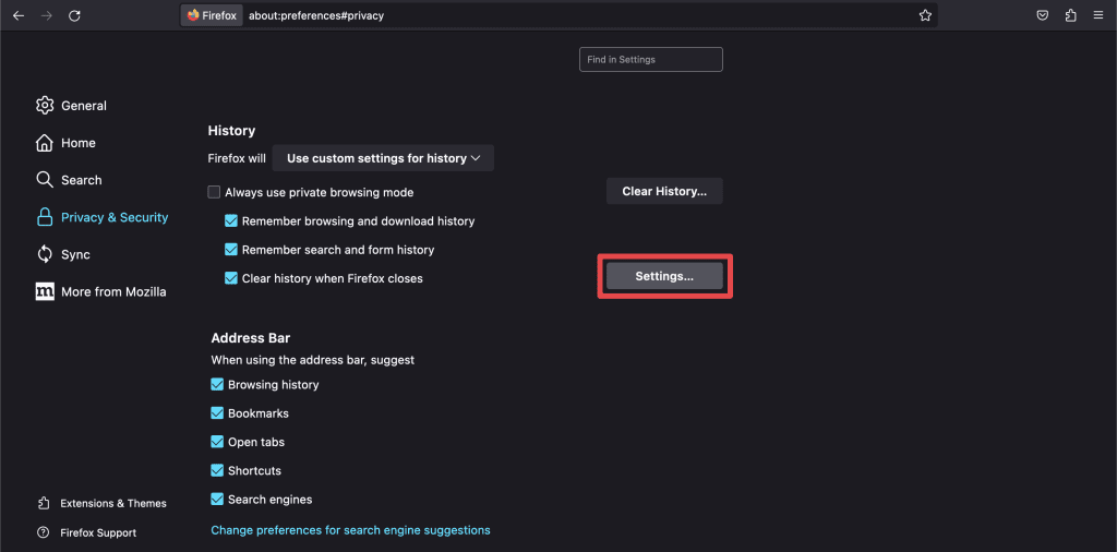 - KliknijUstawieniaprzycisk obokWyczyść historię po zamknięciu Firefoksa.
