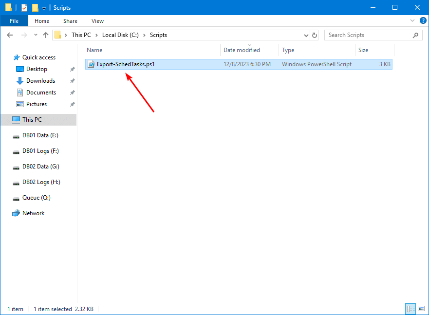 Pobierz i umieść skrypt PowerShell Export-SchedTasks.ps1 w plikuC: Skryptyfalcówka. Skrypt wyeksportuje wszystkie zaplanowane zadania do plikuC: Zadaniafalcówka.