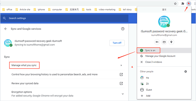 Kliknij ikonę menu profilu w prawym górnym rogu przeglądarki, a następnie kliknij „Włącz synchronizację„KliknijZarządzaj tym, co synchronizujeszopcja.
