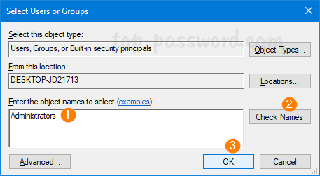 - Wpisz Administratorzy w polu tekstowym „Wprowadź nazwy obiektów do wybrania” i kliknijSprawdź nazwyprzycisk. Jeśli nie znaleziono żadnego błędu, kliknijOK.