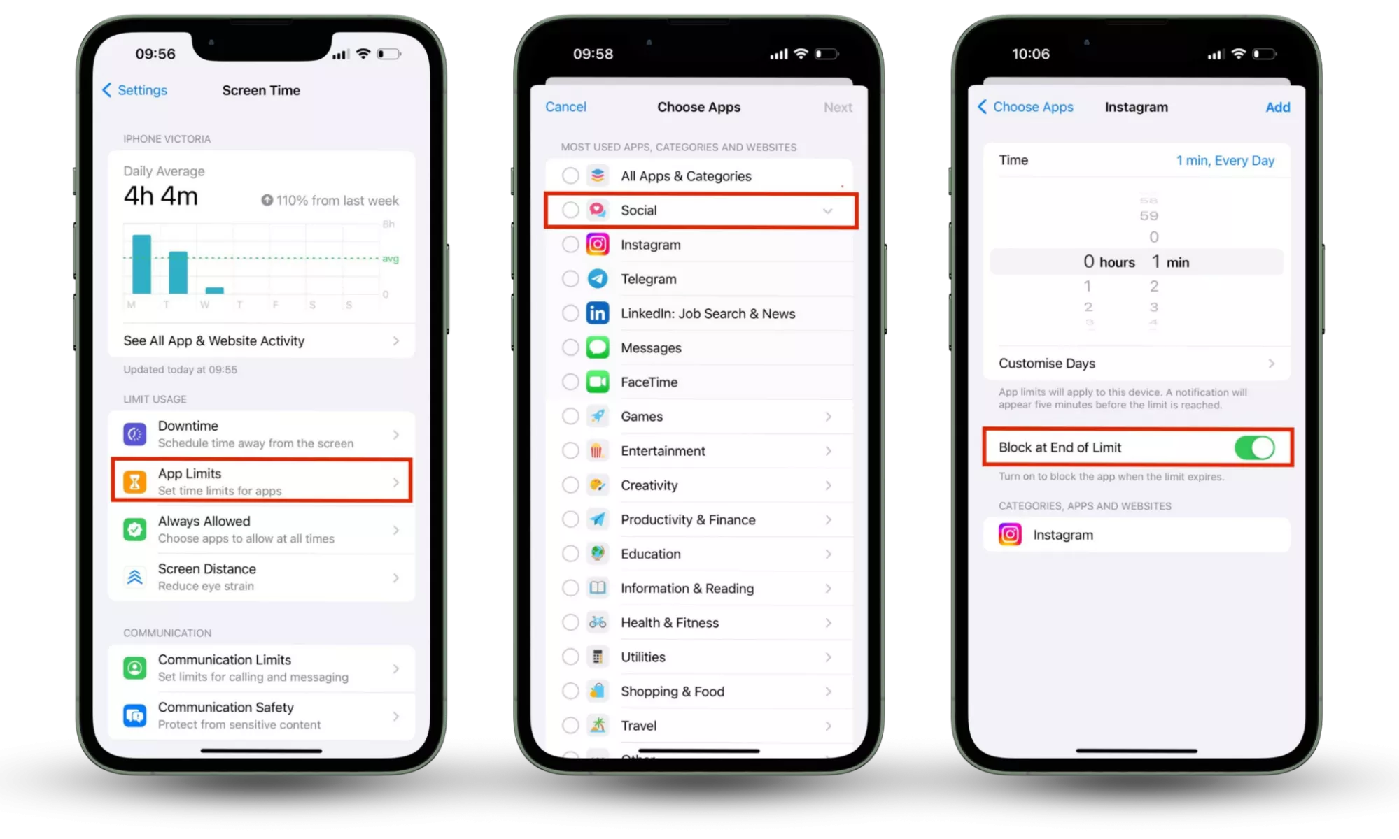 Kroki 4-8. Czas przed ekranem > Limity aplikacji > Dalej > Dodaj.Przy tej konfiguracji Twoje aplikacje zostaną automatycznie zablokowane po minucie bezczynności. Metoda ta jest doskonałym sposobem na: