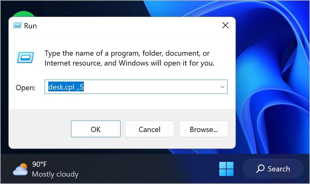 - W aplikacji Uruchom wprowadź poleceniebiurko.cpl ,,5i naciśnij OK.