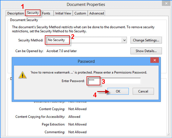 3.NaWłaściwości dokumentukliknij przyciskBezpieczeństwokartę, a następnie wybierzBrak zabezpieczeńz rozwijanego przycisku obokMetoda bezpieczeństwa. Gdy zostaniesz poproszony o hasło uprawnień, wpisz je w polu i kliknijOK.