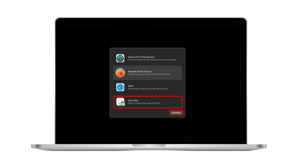 - Po wyświetleniu okna Narzędzia macOS wybierzNarzędzie dyskowei kliknijKontynuowaćprzycisk.