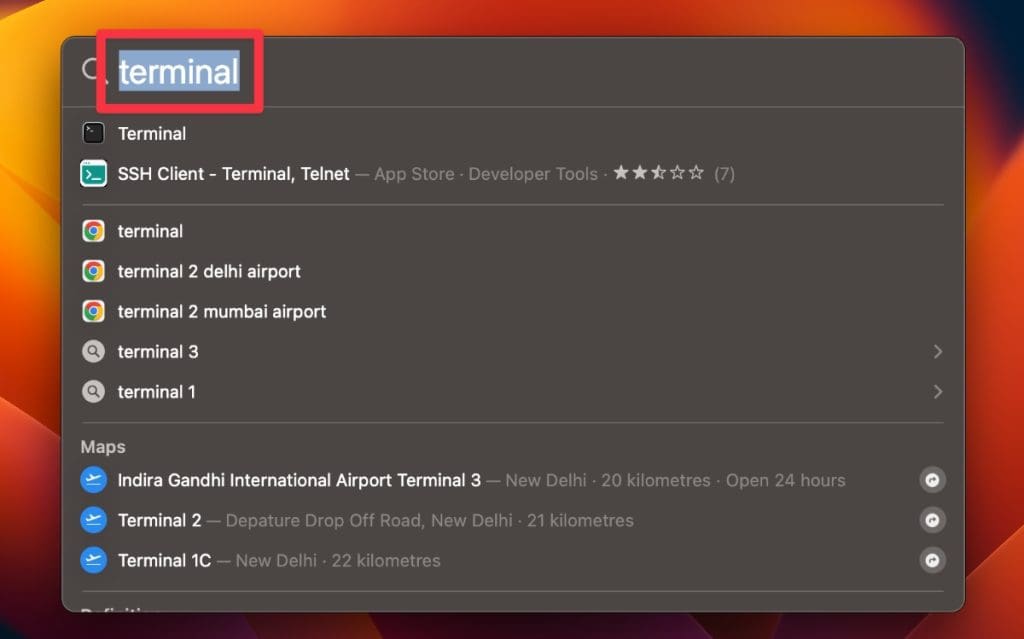 - OtwórzTerminalaplikacja. Znajdziesz go wFinder > Aplikacje > Narzędzialub wyszukaj go za pomocą Spotlight (Polecenie ⌘ + Spacja).