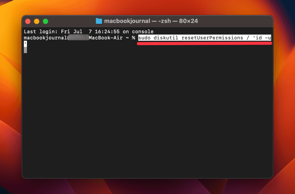 Jeśli Narzędzie dyskowe nie powiedzie się, użyj poleceń terminala, aby ręcznie naprawić uprawnienia dysku na komputerze Mac. Wykonaj poniższe kroki, aby naprawić uprawnienia dysku na komputerze Macza pomocą Terminala:
