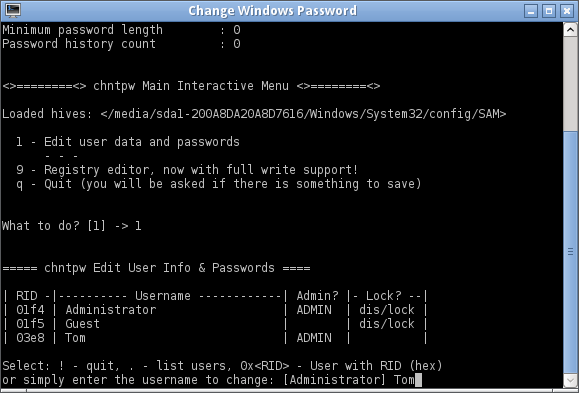 - Zostanie wyświetlone główne menu interaktywne chntpw. Typ1i naciśnij Enter.