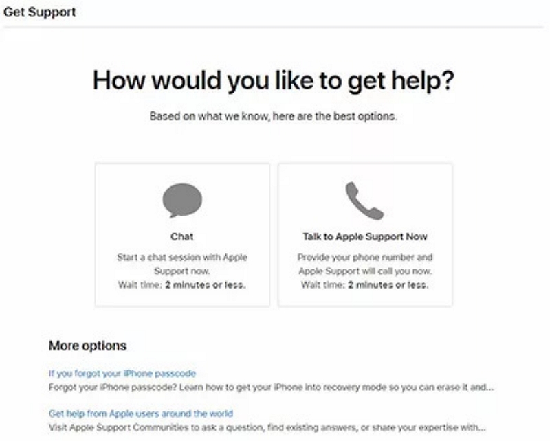 Kiedy stosować:Jeśli powyższe rozwiązanie nie powiedzie się lub hasło iPhone'a samo się zmieni po zainstalowaniu aktualizacji iOS, musisz skontaktować się z zespołem pomocy technicznej Apple w celu uzyskania rozwiązania. Zespół jest w stanie najlepiej poinformować Cię, jak rozwiązać podstawowy problem. Aby jednak wdrożyć to rozwiązanie, iPhone musi należeć do Ciebie, a nie z drugiej ręki, ponieważ będziesz musiał podać istotne informacje, zanim zespół będzie mógł Ci pomóc.
