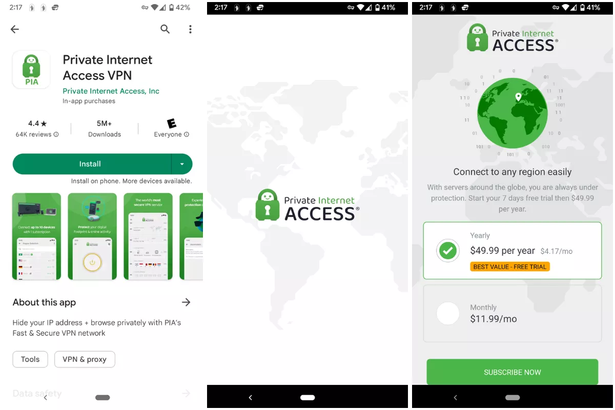 Po pobraniu PIA VPN na Androida możesz uzyskać dostęp do 7-dniowego bezpłatnego okresu próbnego z roczną subskrypcją. W aplikacji na Androida możesz wybrać dwie różne opcje płatności: