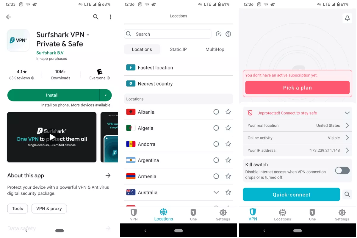 Surfshark oferuje 7-dniowy bezpłatny okres próbny dla użytkowników Androida. Aby rozpocząć bezpłatny okres próbny, musisz wybrać plan płatny i wprowadzić informacje dotyczące płatności, ale możesz anulować subskrypcję w dowolnym momencie przed rozpoczęciem subskrypcji.