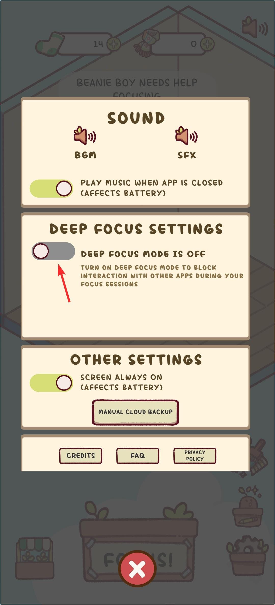 Jeśli opuścisz Deep Focus przed zakończeniem sesji, aplikacja zarejestruje to jako nieudaną próbę. Twój Beanie Boy traci punkty skupienia, a Twoja passa zostaje przerwana. To wbudowana odpowiedzialność – i zachęta do przeciwstawienia się pokusie.