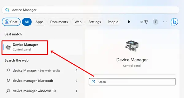 1. Kliknij przycisk Windows i wpiszMenedżer urządzeń,i otwórz go.