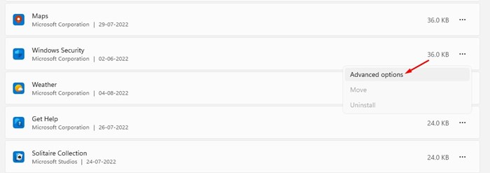 3. Znajdź aplikację Windows Security i kliknijtrzy kropkiobok niego.