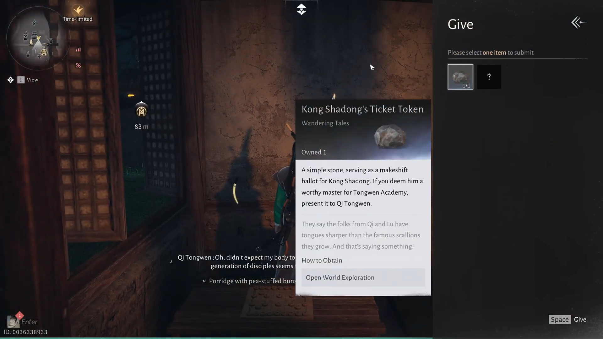 Kong Shadong, kandydat na nauczyciela, wręcza ci żeton biletu, który musisz dostarczyć Mistrzowi Qi. Siedzi na dziedzińcu budynku rezydencji Zhang Quo przed akademią, po drugiej stronie ulicy.