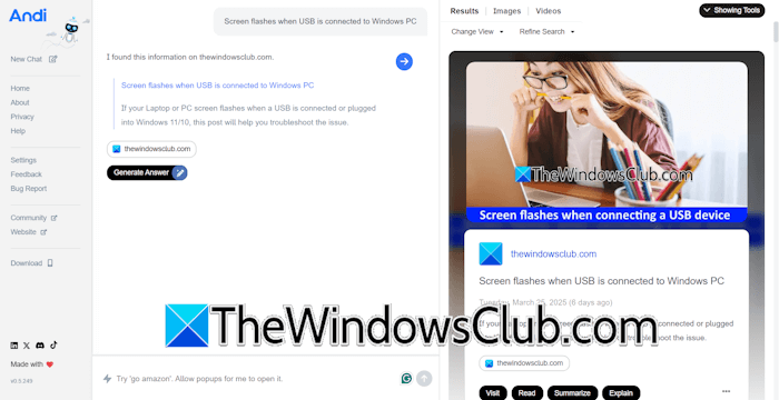 Andi to prosta wyszukiwarka AI. Bezpośrednio wyświetla strony internetowe dla Twoich zapytań; możesz odwiedzić dowolne z nich. Jest również dostępny jako rozszerzenie Chrome, które pozwala ustawić go jako domyślną wyszukiwarkę w Google Chrome.