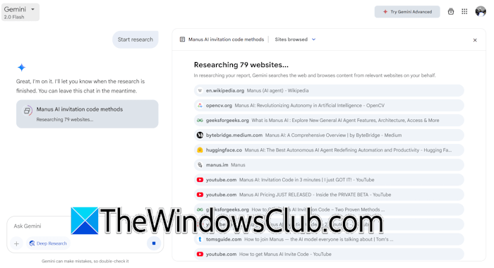 to popularne narzędzie AI firmy Google. Możesz także użyć go jako narzędzia wyszukiwarki AI, aby uzyskać odpowiedzi na swoje zapytania, włączając tę funkcjęGłębokie badaniaopcja. Gemini Deep Research zaprojektowano tak, aby sprostać złożonym zadaniom badawczym, dzieląc je na części, przeglądając je w Internecie, a następnie prezentując użytkownikowi ostateczny, dopracowany wynik.
