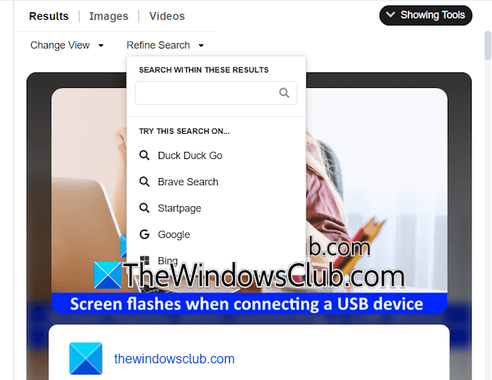 Możesz także zawęzić wyniki wyszukiwania, wybierając konkretną wyszukiwarkę z listy. Po wybraniu wyszukiwarki otworzy się nowa karta w Twojej przeglądarce internetowej, pokazująca wyniki wyszukiwania dla tej wyszukiwarki.