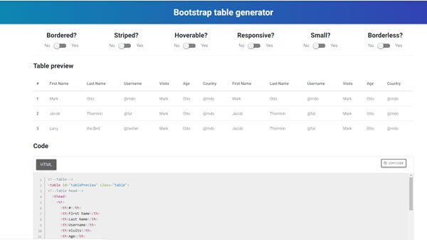 Jeśli masz minimalną wiedzę na temat HTML, pomocny będzie dla Ciebie generator tabel Bootstrap. W przeciwnym razie nie zaleca się korzystania z tego narzędzia do tworzenia stołów online. Domyślnie możesz utworzyć tabelę 4×12. Jeśli jednak znasz HTML, możesz użyć „Edytora MDB”, aby dodać dowolną liczbę kolumn i wierszy. Bez względu na to, co zrobisz, będziesz musiał skopiować kod HTML i wkleić go gdzieś. Oprócz tego otrzymasz kilka opcji dodawania lub usuwania obramowań, stylów najechania kursorem, małych pól i nie tylko. Odwiedź ichoficjalna strona internetowa.