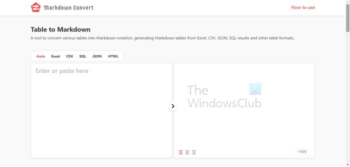 OK, więc jeśli chodzi o konwersję tabeli Excela na Markdown, jest to łatwiejsze, niż wielu mogłoby pomyśleć. Wszystko, co musisz zrobić, to wybrać komórki, które mają zostać przekonwertowane. Skopiuj te komórki do schowka. Stamtąd odwiedźtabletomarkdown.comi wklej skopiowaną tabelę w polu. Na koniec kliknij przycisk Konwertuj.