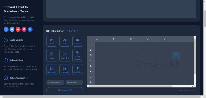 Truben Table Editor ma prawdopodobnie najprostszy interfejs użytkownika z minimalnymi opcjami. Na stronie Markdown znajdziesz wszystkie opcje umożliwiające utworzenie tabeli zgodnie ze swoimi wymaganiami. Zaletą korzystania z tego narzędzia jest to, że możesz utworzyć dowolną liczbę kolumn i wierszy. Jeśli jednak chcesz wyświetlić swoją tabelę na stronie internetowej, zaleca się skorzystanie z opcji generatora tabeli HTML. Jeśli tak wybierzesz, musisz wkleić cały kod na swoją stronę. Wadą jest to, że nie ma możliwości dostosowania stołu. Na przykład nie można zmienić koloru tła, koloru tekstu itp. Odwiedź ichoficjalna strona internetowa.