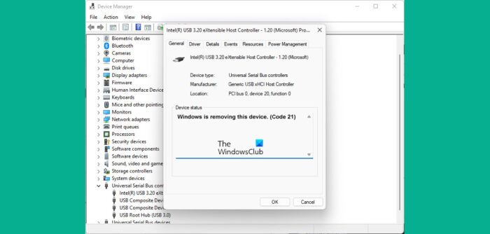 Kod błędu 21to kod błędu Menedżera urządzeń w systemie Windows 11/10, który pojawia się wraz z komunikatem o błędzie,System Windows usuwa to urządzenie. Chociaż nie jest to uciążliwy błąd i nie ma większych konsekwencji, może się zdarzyć, że ten komunikat utknie na komputerze na wiele godzin. W tym artykule wyjaśnimy, czym jest ten błąd, dlaczego możesz się z nim spotkać i jak możesz się go pozbyć ze swojego komputera.