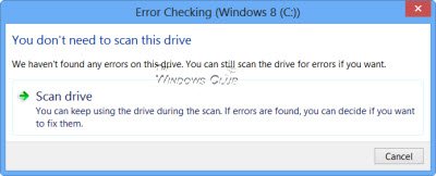 Czasami możesz zobaczyć komunikat –System Windows znalazł błędy na tym dysku, które wymagają naprawy. Jeśli go widzisz, możesz chcieć uruchomić skanowanie ręcznie. Wcześniej konieczne było zaplanowanie sprawdzania błędów dysku dla dysku systemowego oraz dysków, na których otwarte były pliki, procesy lub foldery. W systemie Windows 11/10 sprawdzanie błędów rozpoczyna się natychmiast, nawet na dysku systemowym – i nie trzeba już planować tego podczas uruchamiania. Tylko w przypadku wykrycia błędów konieczne będzie ponowne uruchomienie komputera, aby system Windows 11/10 mógł je naprawić.