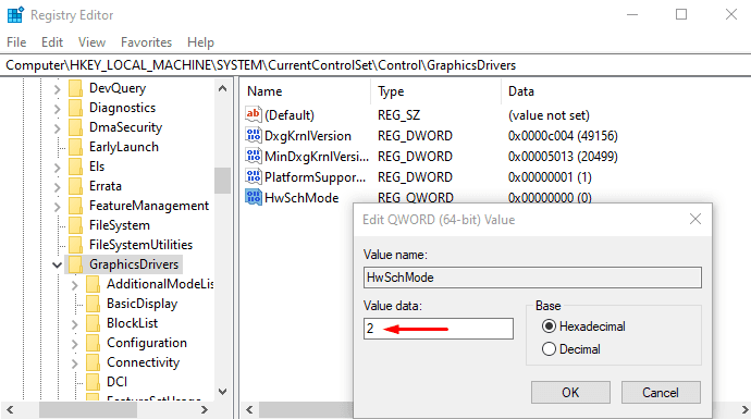 Możesz także użyć Edytora rejestru, aby włączyć opcję Włącz planowanie GPU ze wspomaganiem sprzętowym na urządzeniu z systemem Windows 11/10.