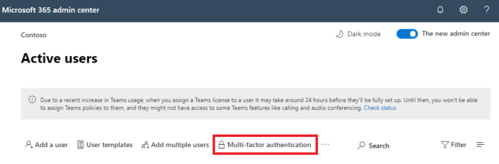 - Przejdź doUżytkownicysekcję, wybierzAktywni użytkownicyi kliknijUwierzytelnianie wieloskładnikowe.