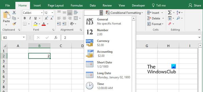 Istnieje możliwość wprowadzania formuł do komórki w postaci zwykłego tekstu, a nie formuł. I to jest powód, dla którego nie otrzymujesz żadnej wartości, ponieważ obliczenia w Excelu działają tylko na formule. Aby to naprawić, uruchom Excel, przejdź do strony i kliknij komórkę z formułami. Kliknij kartę Strona główna, przejdź do sekcji Numer, kliknij menu rozwijane i wybierz jedną z dwóch opcji: Ogólne lub Numer. Możesz łatwo przeliczyć, klikając dwukrotnie komórkę.