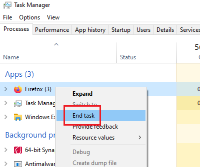 Jeśli Firefox zużywa dużo zasobów systemowych, może to być spowodowane intensywnymi procesami lub pobieraniem plików w Firefoksie. W takim przypadku kliknij prawym przyciskiem myszy proces Firefox w plikuMenedżer zadańi wybierzKoniecproces.