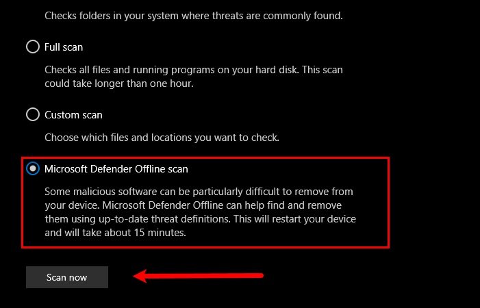 - WybieraćProgram antywirusowy Microsoft DefenderLubSkanowanie w trybie offline programu Microsoft Defender.