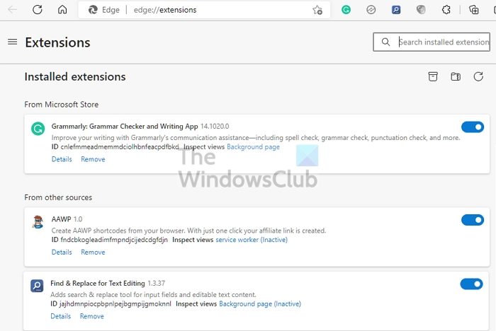 - Następnie po prostu wyłącz przełącznik powiązany z konkretnym rozszerzeniem, aby je wyłączyć. Możesz też kliknąć przycisk Usuń, jeśli chcesz odinstalować to rozszerzenie.