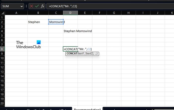 =CONCAT("Mr. ",C2)Po wstawieniu go do odpowiedniej komórki naciśnij klawisz Enter. Powinieneś zastąpić Mr. preferowanym tekstem, a C2 wybranym odwołaniem do komórki.