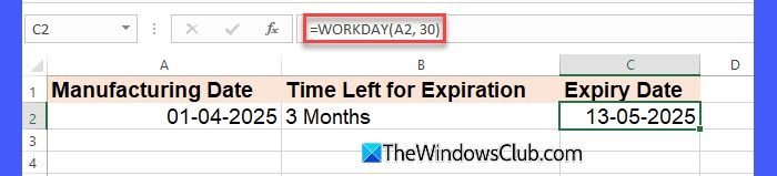 W tym samym przykładzie, jeśli produkt wygasa30 dni roboczych później, możesz zastosować następującą formułę w komórce B2, aby obliczyćdata ważności: