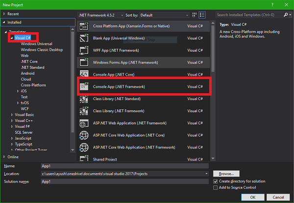Tylko na początek i prosty przykład programu, WybierzBiblioteka Visual C#w lewym panelu iAplikacja konsolowana liście komponentów. A teraz uderzOK.
