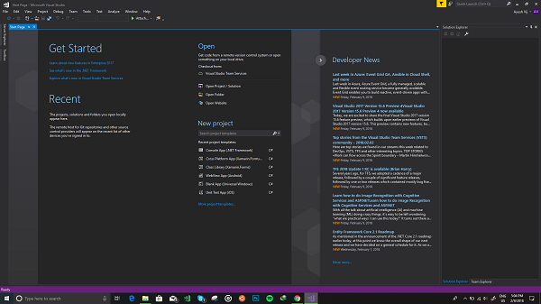 Teraz po uruchomieniu programu Visual Studio zostanie wyświetlony monit o zalogowanie się przy użyciu konta Microsoft. Jeśli korzystasz z wersji Professional lub Enterprise, radzę zalogować się przy użyciu adresu e-mail użytego do zakupu subskrypcji. Po zalogowaniu zobaczysz toRozpocznijstrona.