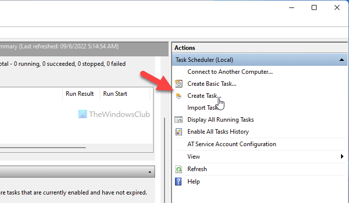Najpierw musisz otworzyć Harmonogram zadań na swoim komputerze. W tym celu możesz poszukaćharmonogram zadańw polu wyszukiwania na pasku zadań i kliknij konkretny wynik wyszukiwania. Następnie kliknij przyciskUtwórz zadanieprzycisk.