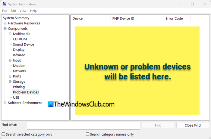 Otwórz wbudowane Informacje o systemie (msinfo32) > Komponenty i rozwiń opcję Urządzenia powodujące problemy. Jeśli istnieją nieznane urządzenia, zobaczysz je tutaj.